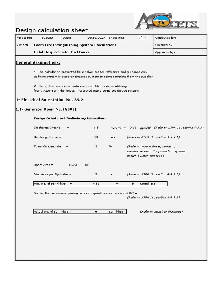 The formula for calculating the needed foam concentrate at a flammable liquid release is as follows. Design calculation sheet Project no. Foam Fire Extinguishing System Calculations.