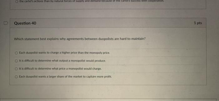 Cartels are difficult to maintain because. Which of the following best explains why cartel agreements are hard to maintain. And you want to influence the factors that favor cartels which is one of the latest moves or latest developments in anti-trust policy. Cartel Agreements Are Conducive To Monopoly Outcomes. 1 Answer to Collusive agreements are typically difficult for cartels to maintain because each firm can increase profits by. Cartel agreements are difficult to sustain because. It is difficult to enforce a cartel agreement.