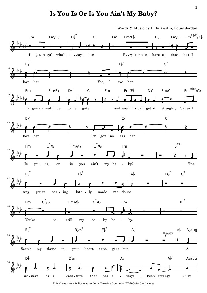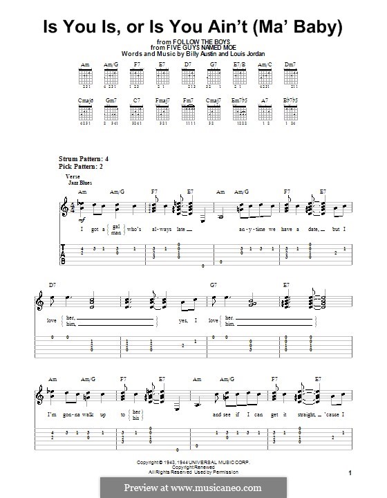 Sheet music by Louis Jordan. I got a gal whos always late Anytime we have a date But I love her Yes I love her Im gonna walk right up to her gate And see if I can get it. Youse is still my baby baby. Chorus Em B7 Em B7 Em B7 Em B7 Is you is or is you aint my baby A7 D7 G B7 Way youre acting lately makes me doubt Em B7 Em B7 Em B7 Em B7 Youse----- is still my baby. 22381 views added to favorites 247 times. Print and download Is You Is or Is You Aint My Baby. Aprende a tocar el cifrado de Is You Is Or Is You Aint My Baby Louis Jordan en Cifra Club.