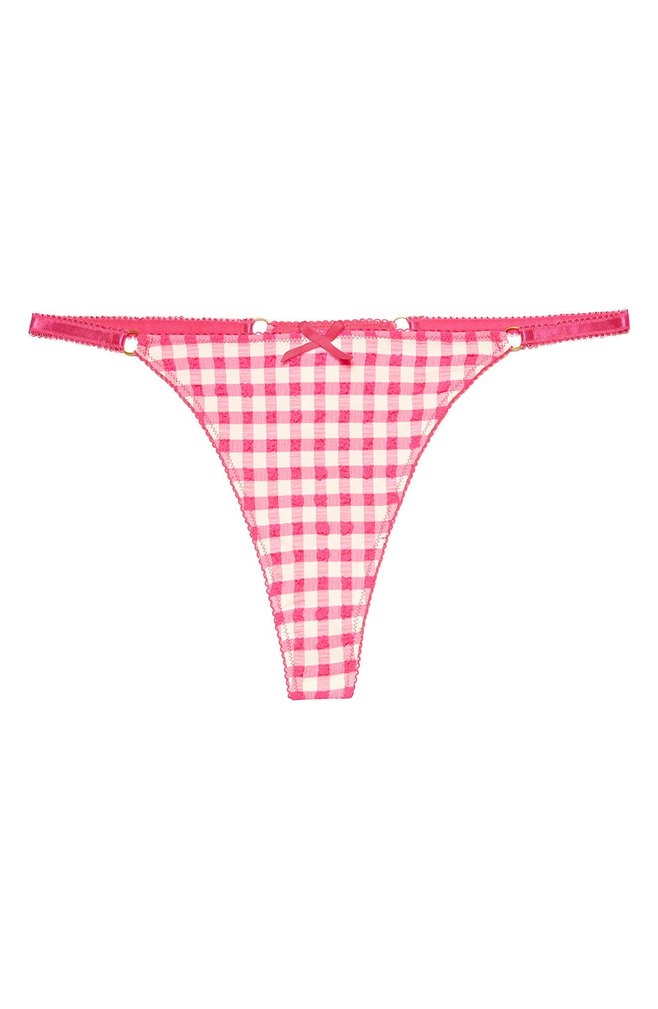 The bottom is a thong with adjustable string. Feel flirty in our Daisy Gingham ThongHot pink and white gingham patterned thong finished with pink strappy hips and a pink satin bow in the centre. Pink Gingham Thong Elasticated Waist Pink Bow Detail Gold Hardware Product Info Main.